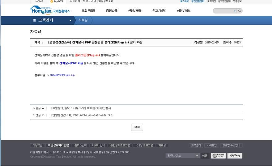 2. 자료실 중 “[연말정산간소화] 전자문서 pdf 진본검증 플러그인(Plug in) 설치 파일” 클릭