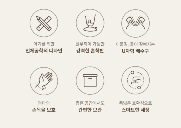 무엇보다 설치할 때의 편리함이 돋보이는 건 이 제품의 큰 장점이죠. 어떤 세면대에도 쉽게 부착 가능한 강력한 흡착판 덕분에 견고하게 지지해주니, 엄마의 마음까지 든든해져요.아기비데 사용법도 참 간단해요. 물기를 잘 닦아낸 후, 세면대 위에 올려놓기만 하면 돼요. 엄마의 손목에 부담 가지 않게, 쉽게 붙일 수 있으니까요. 청결을 유지하면서도 아이와의 스킨십 시간까지 증가시킬 수 있으니, 육아의 질도 한 단계 업그레이드 되는 거죠.비데 사용 후에는 건조를 잊지 마세요! 자리를 차지하지 않도록 디자인된 후면 걸이를 이용하면 간편하게 건조할 수 있어요. 보송보송하게 건조되어 다음 사용시에도 쾌적함을 그대로 유지할 수 있답니다. 아기비데, 육아의 작은 변화로 큰 행복을 맞이해보세요.